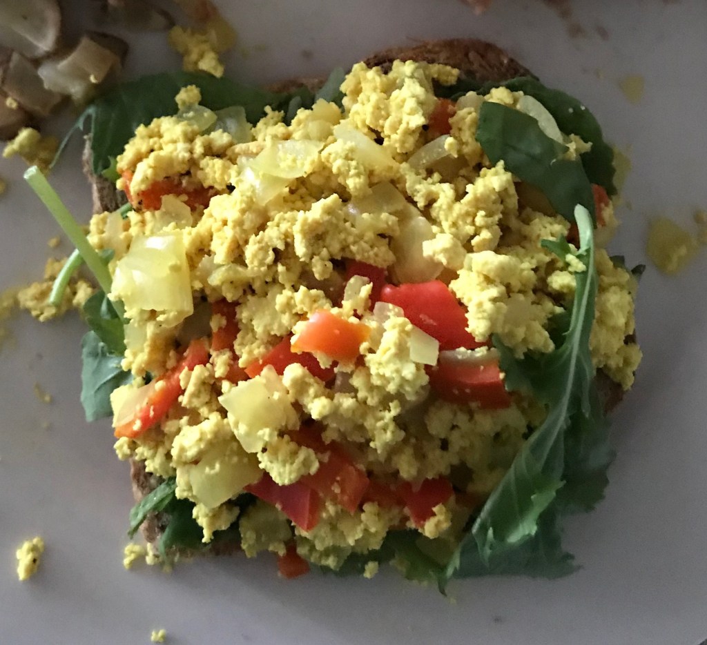 Tofu crumbles are used as a scrambled egg alternative. Eat them as an egg sandwich or in your fried rice. This recipe was tweaked from Nora Cooks. We added sauteed onion and peppers.