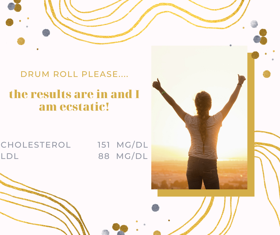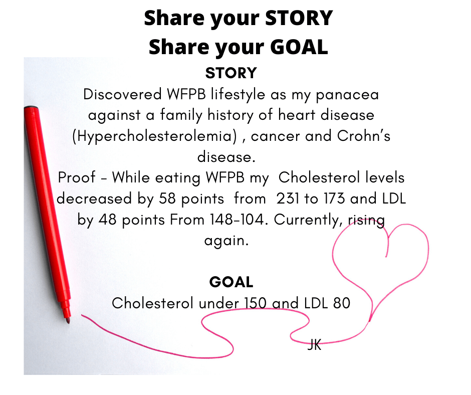 Fast forward to September 28: the results are in and I am ecstatic! I want to shout from the roof top that it IS possible to control your health , reverse your numbers and possibly reverse your risk factors eating a whole food plant based diet. Back on May 10th, I posted “Share your STORY, Share your GOALS” on PBnJ Facebook page. The purpose of the post was to share with my PBnJ face book friends, why I started exploring the WFPB lifestyle. I wanted to address a history of familial hypercholesterolemia and heart disease using a whole food plant based diet as a prescription for good health. I enlisted the expertise of my PCP, (Dr.Schulze) and a local dietician (Shelby Killion) to help me better understand the nutritional aspects of my condition. We discussed possible natural treatment including flaxseed meal daily (1 tbs), increasing my legume consumption (no exact amount given), as well as, continuing meditation (defined for me as continuing my prayer life), and increasing my daily activity (since all I did was walk my dog 1/2 mile daily). The “My Fitness Pal” app also helped me get the recommended proportions of protein, fat and carbohydrates.